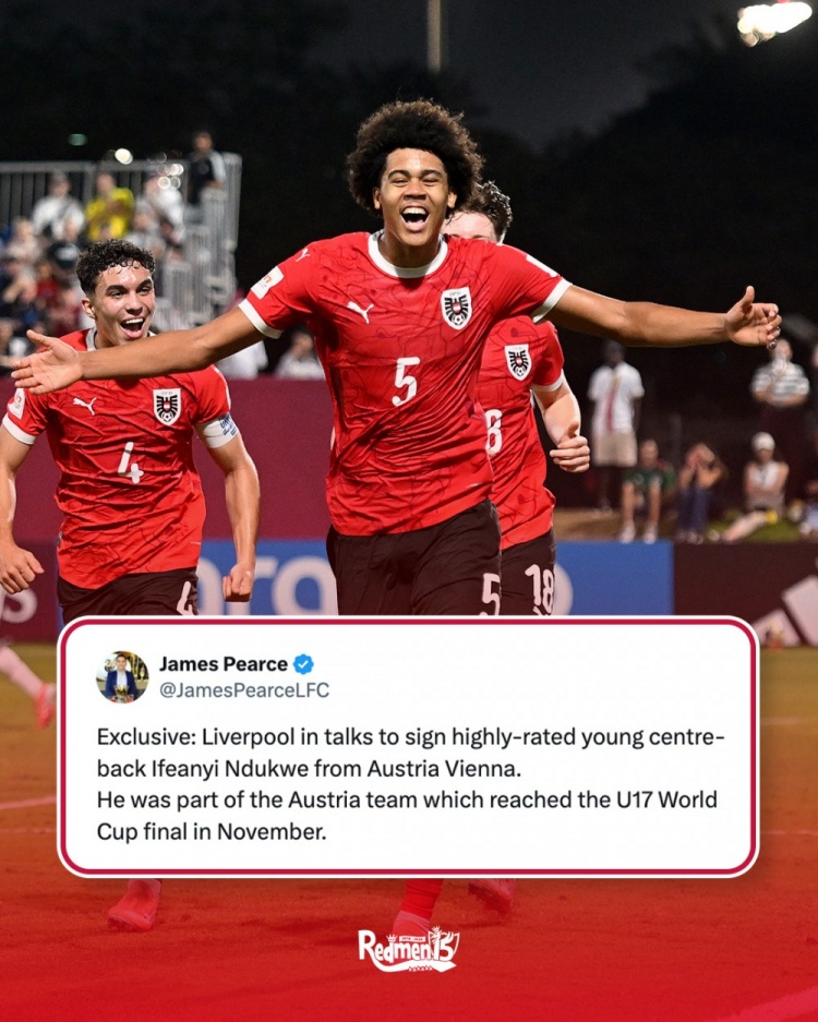 潜力股!TA:利物浦商谈引进奥地利维也纳17岁中卫恩杜克韦 -