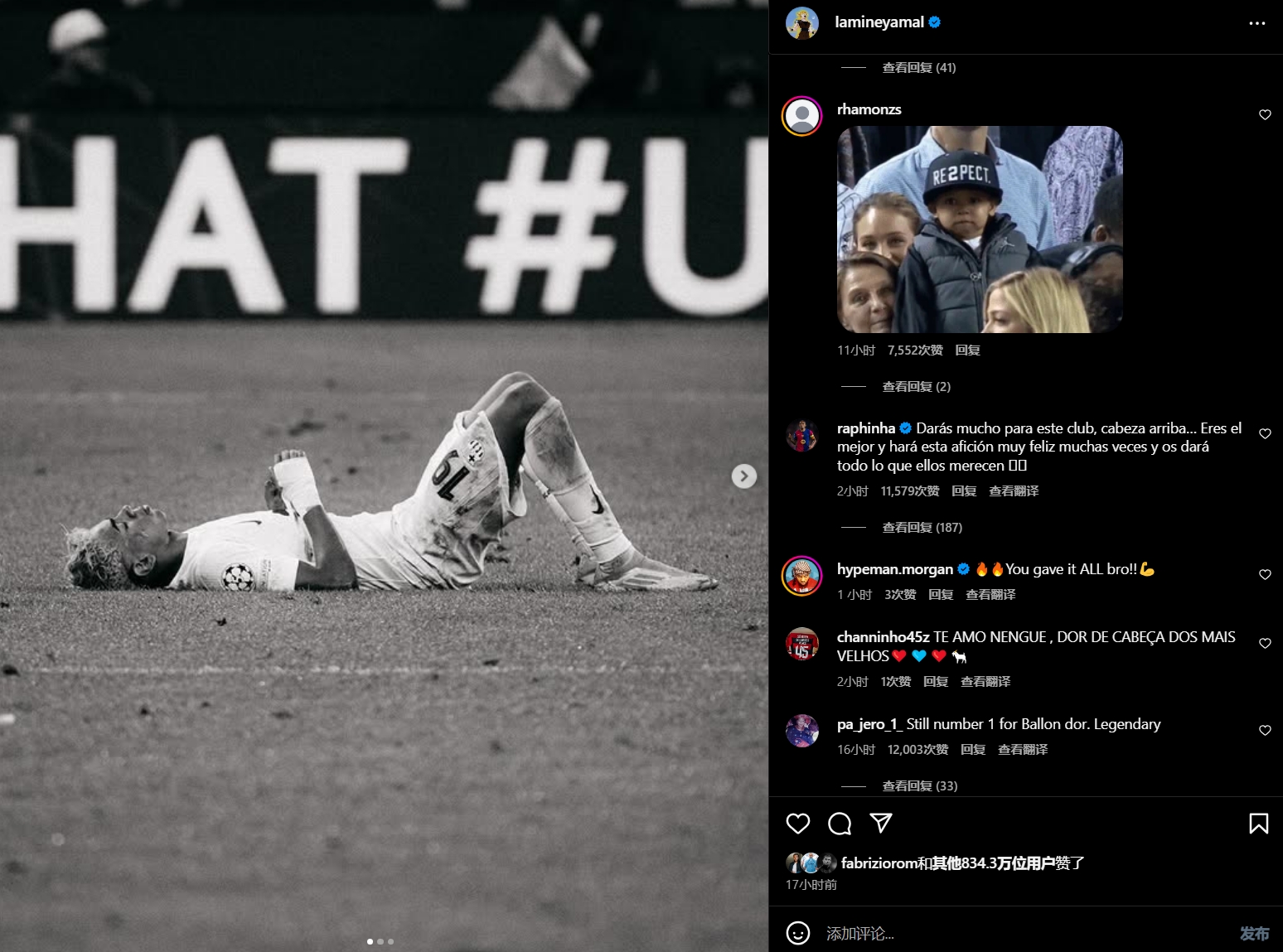5月8日讯 巴萨在欧冠半决赛被国米淘汰,亚马尔在社媒上表态决心要带领巴萨重返巅峰。拉菲尼亚留言亚马尔,鼓励他要保持信心。