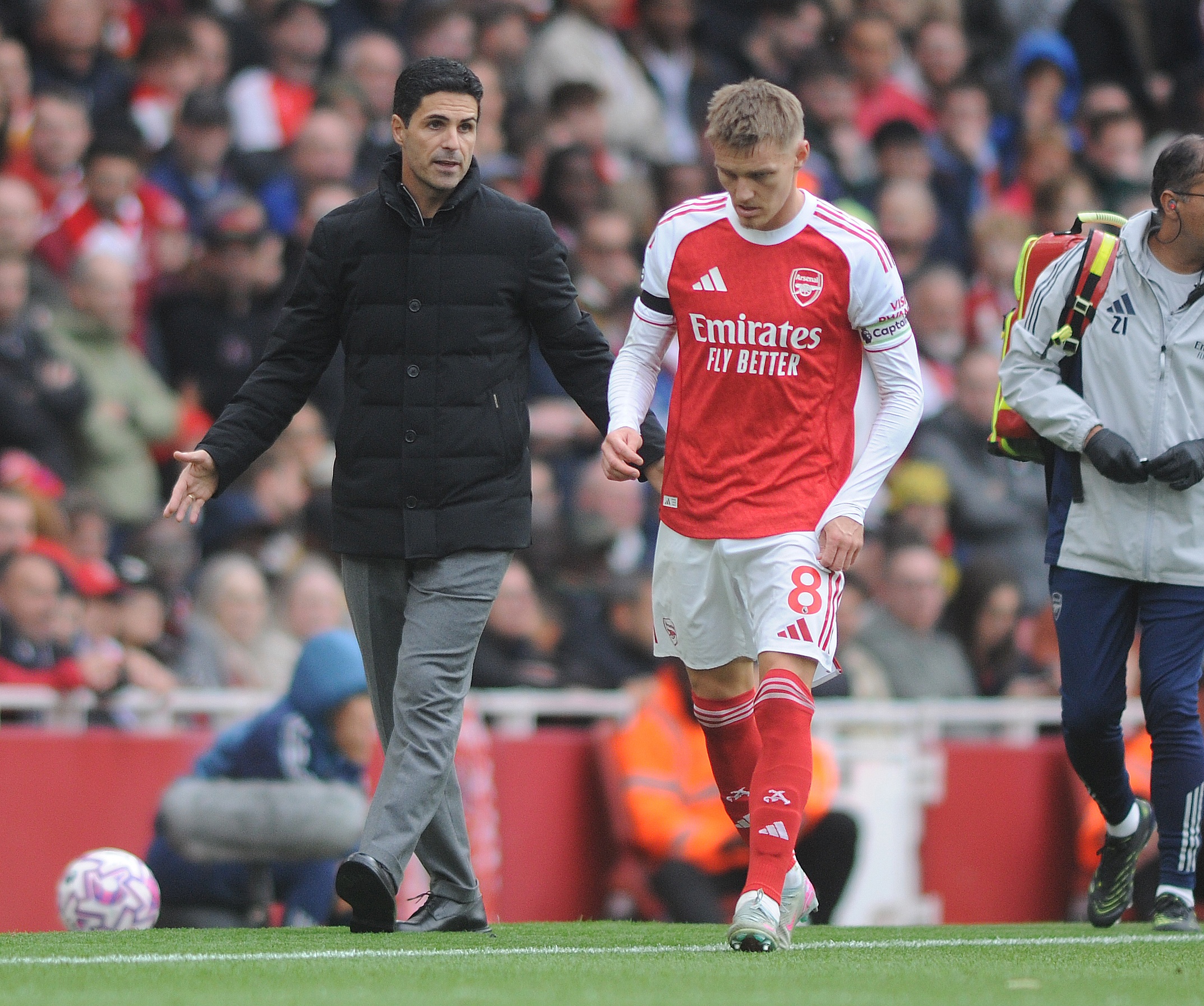 10月6日讯 英超第7轮比赛,阿森纳2-0击败西汉姆,但刚刚从肩伤中复出的厄德高因膝伤离场,而赖斯因背伤离场。
