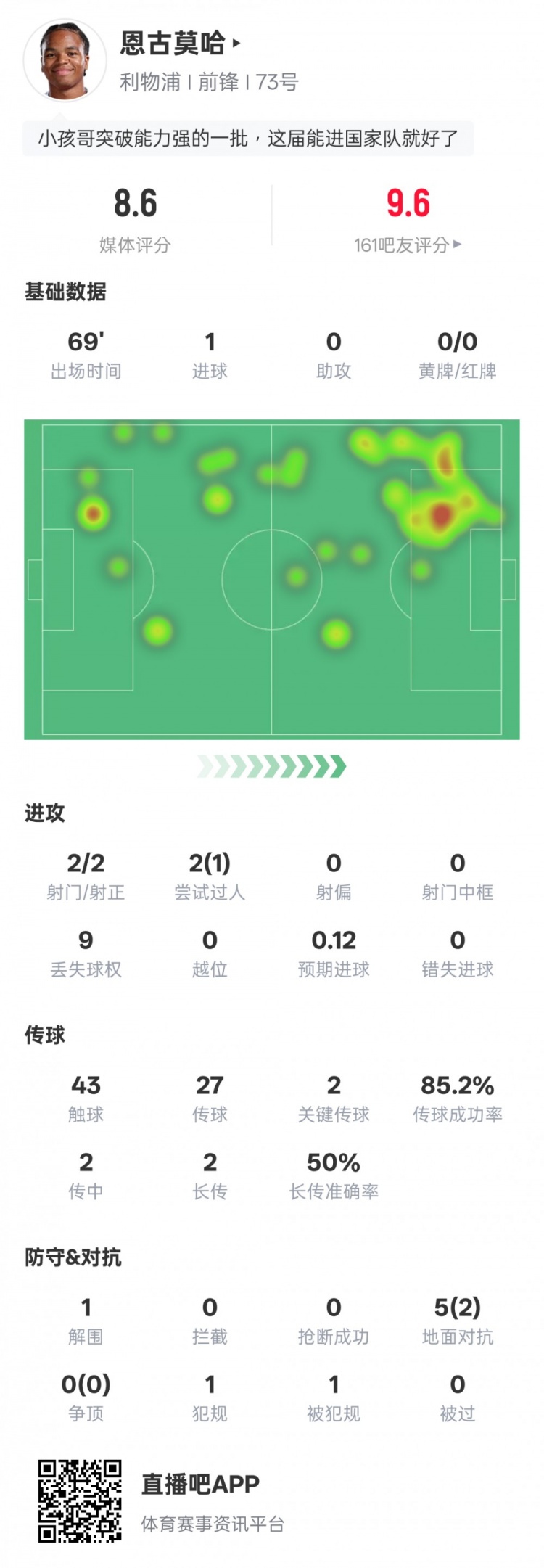 恩古莫哈本场数据:1进球1过人成功2关键传球,评分8.6