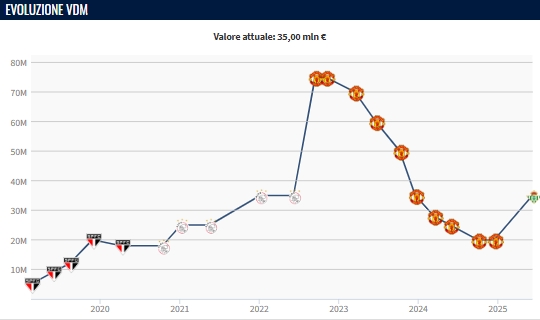 跌停开涨!安东尼身价暴涨1500万欧 在曼联从7500万7连跌到2000万 来源:24直播网 发布日期:2025-06-10 08:31 06月09日讯 德转更新西甲球员身价,效力于贝蒂斯的安东尼身价暴涨1500万欧元,从2000万欧元涨至3500万欧元!加盟曼联前,安东尼在阿贾克斯的身价只有3500万欧元,2022年夏窗9500万欧元加盟曼联后,他的身价飙升至7500万欧元!而在2022年11月-2024年10月,安东尼的身价经历7次下跌,最终跌至2000万欧元。本赛季安东尼共出场40次,其中为贝蒂斯出场26次打入9球5助攻,帮助贝蒂斯最终排名西甲第6位,同时收获欧协联亚军。